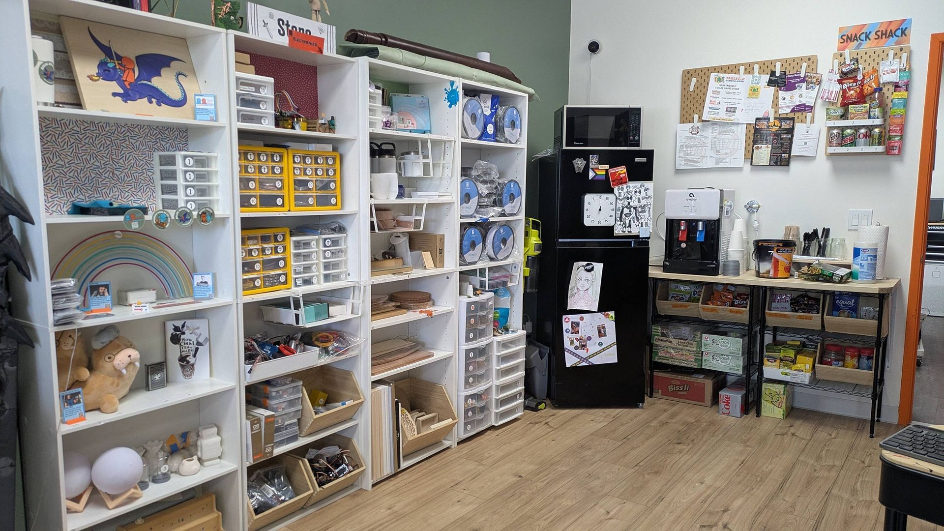 Can’t find what you are looking for in the workshop? Check out our Store of unique arts, crafts, and STEM tools and materials. The Store contains a wide range of items including: scale model items, DnD mini-figures, ceramic planters, scrapbook paper, yarn, electronic components, and more. We even have a snack bar with snack and drinks.