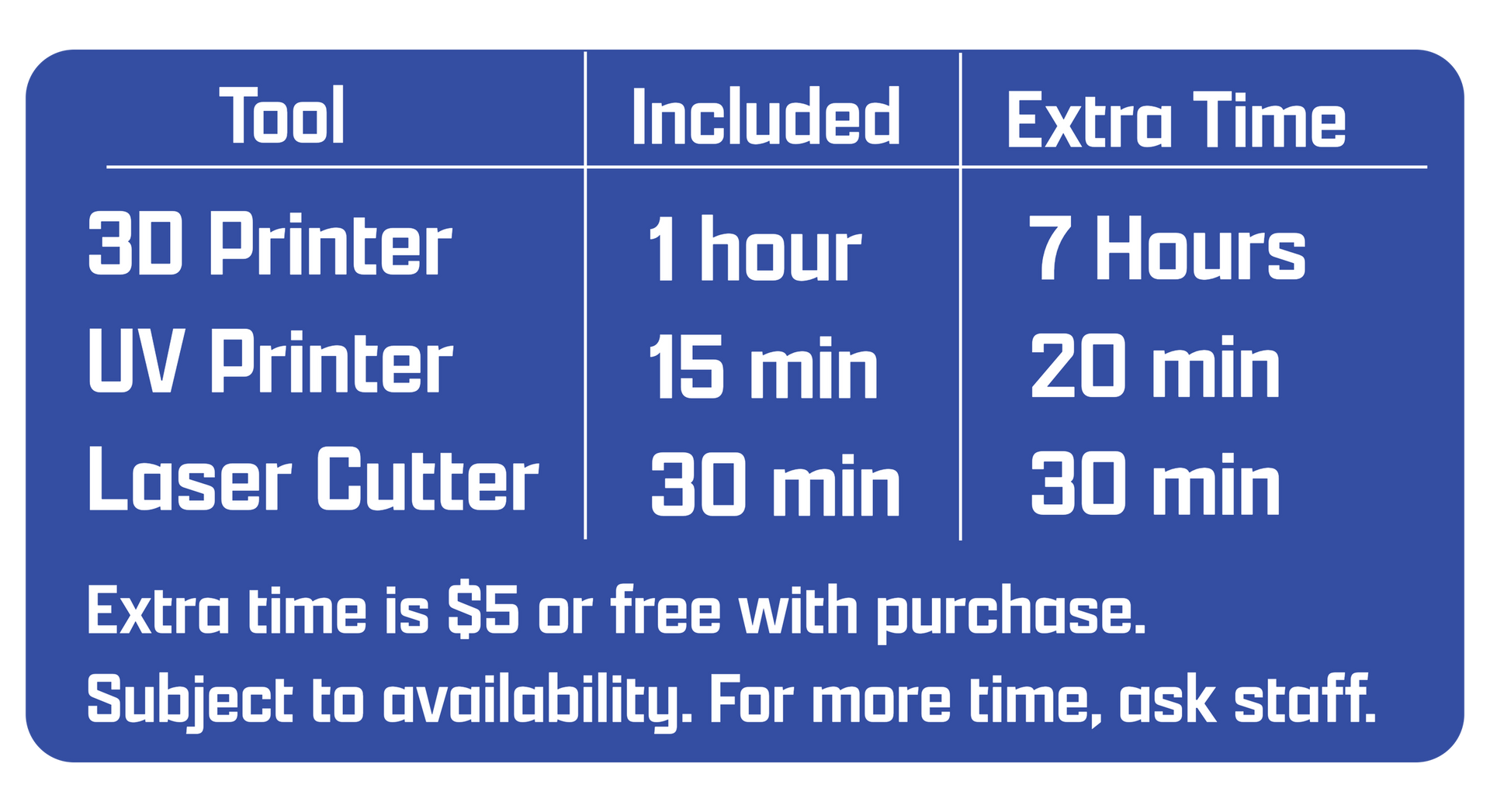 Use this chart to determine the price of using our digital fabricaiton tools. These prices are for members/day-pass-holders who are physically in the Makerspace and are operating the tools themselves (with staff help). The 'Extra Time' is IN ADDITION to the 'included' time.